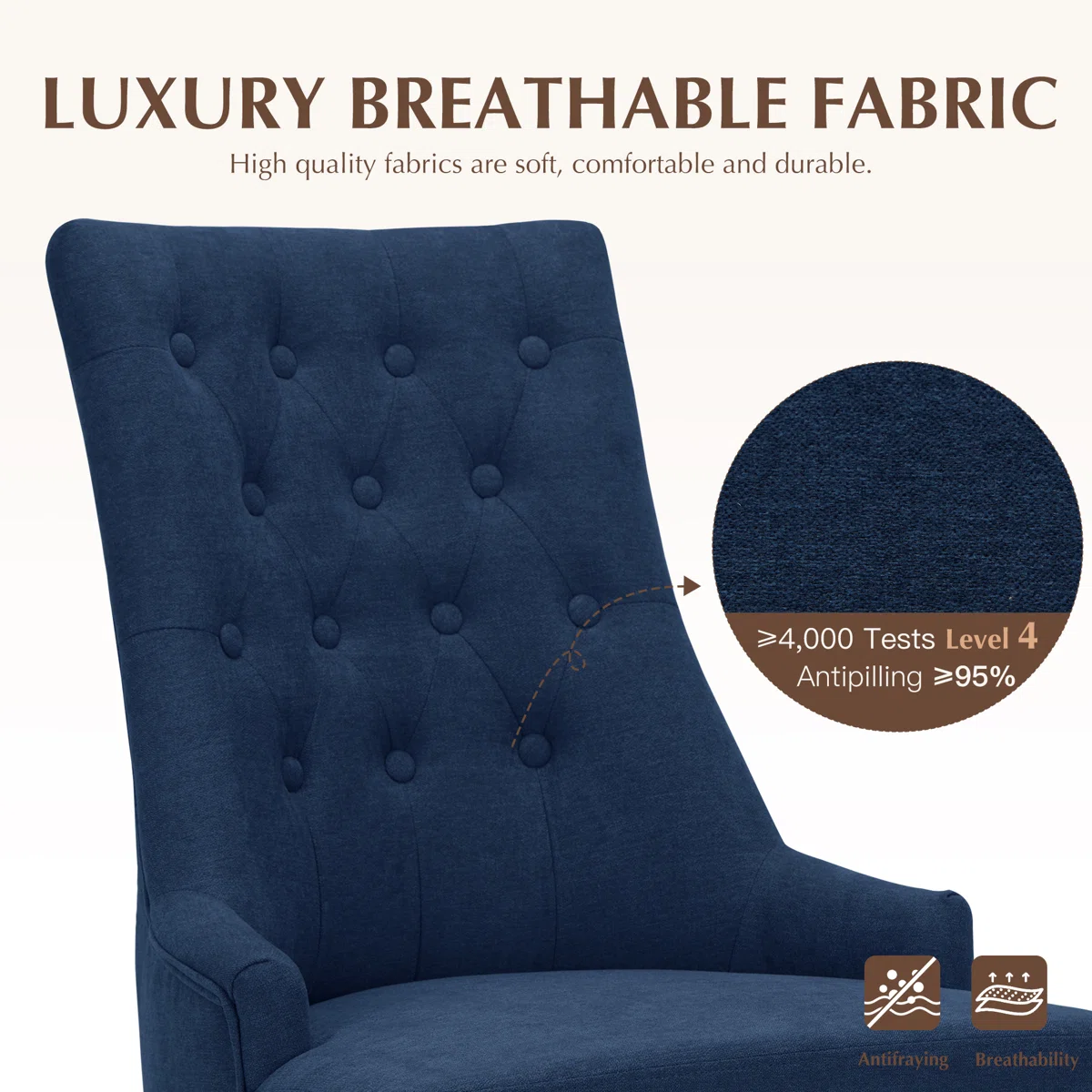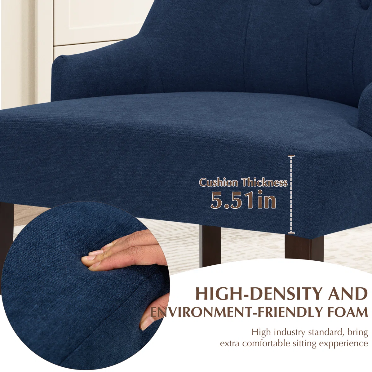 Material: Solid wood frame and legs; linen-textured fabric upholstery; foam padding