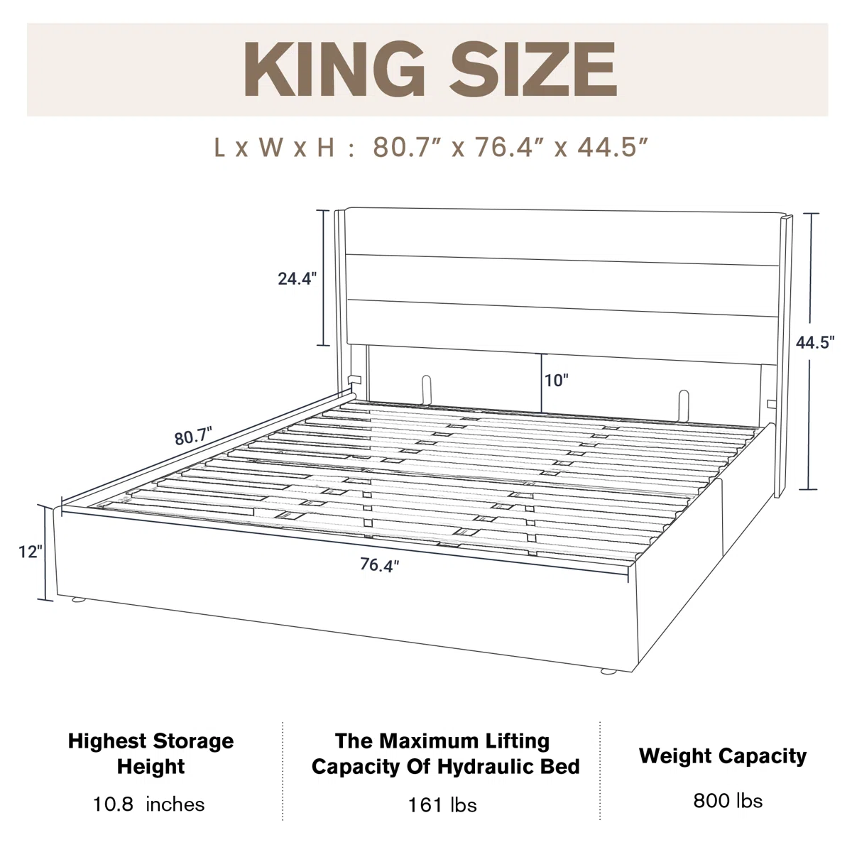 Experience modern comfort and smart storage with this hydraulic lift platform bed. Fully upholstered with a stylish wingback headboard, it opens effortlessly to reveal spacious under-bed storage—perfect for bedding, luggage, and seasonal clothes. Sturdy slats support your mattress without a box spring.