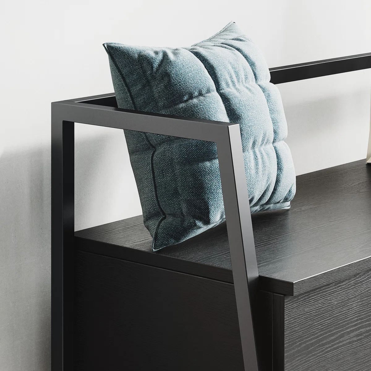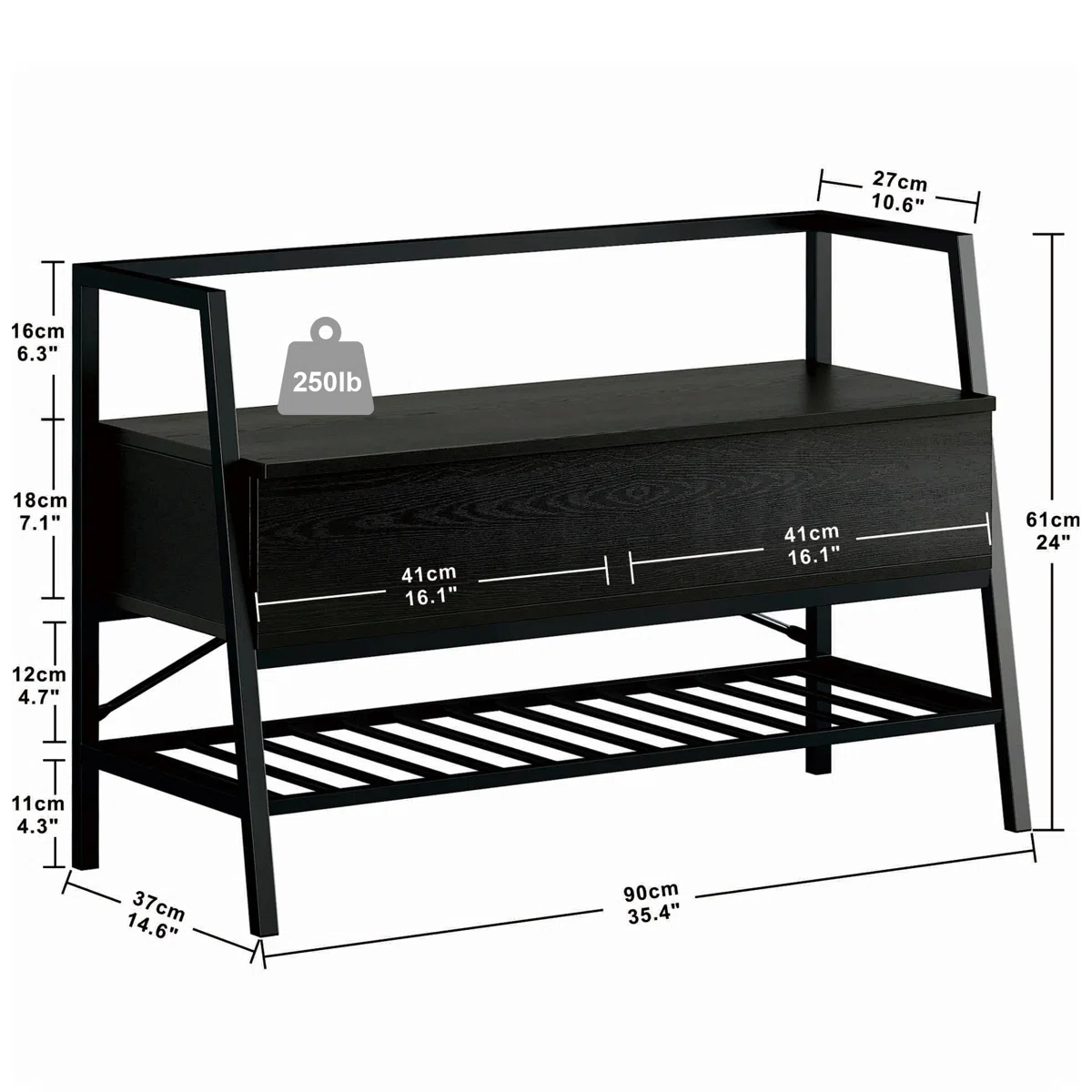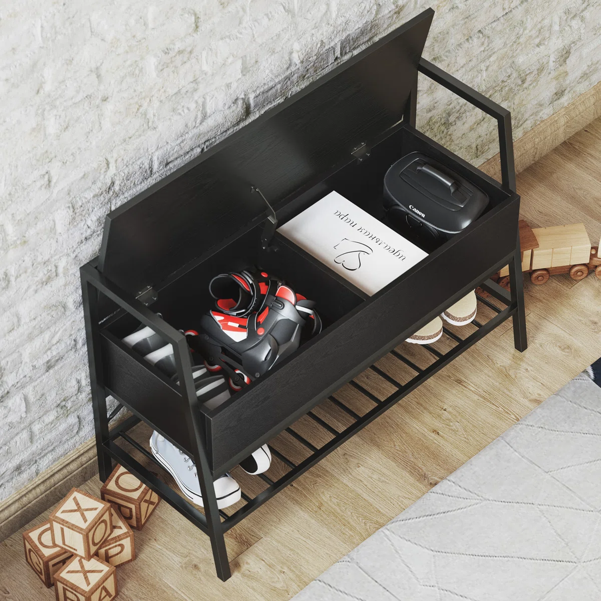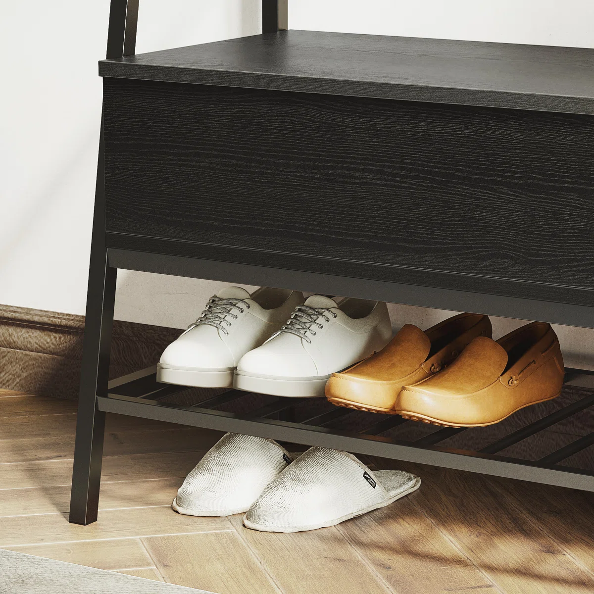 The bench features a matte-coated iron frame with open arms and back, paired with a high-quality engineered wood seat. Lift the seat to reveal a spacious compartmentalized storage area for shoes, bags, or other household items. Below, a slatted metal shelf offers additional space for frequently used footwear.