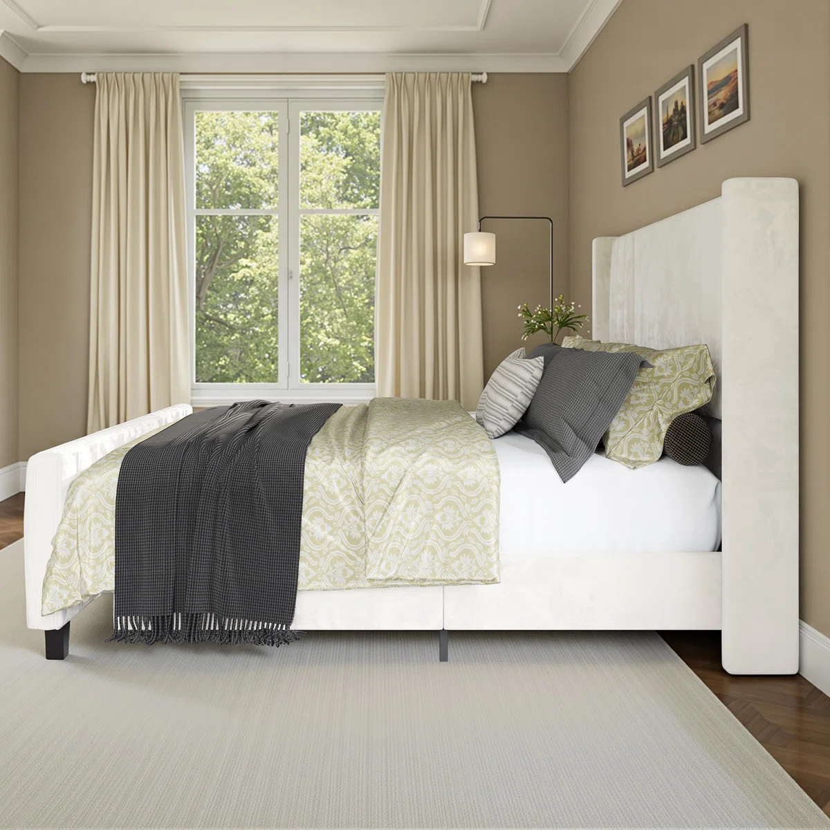 Elevate your bedroom with this modern velvet channel-tufted wingback platform bed. Its glam wingback headboard with vertical channel tufting creates a bold statement while providing cozy support. Upholstered in luxurious velvet with a subtle sheen, this bed adds elegance and comfort to any sleep space.