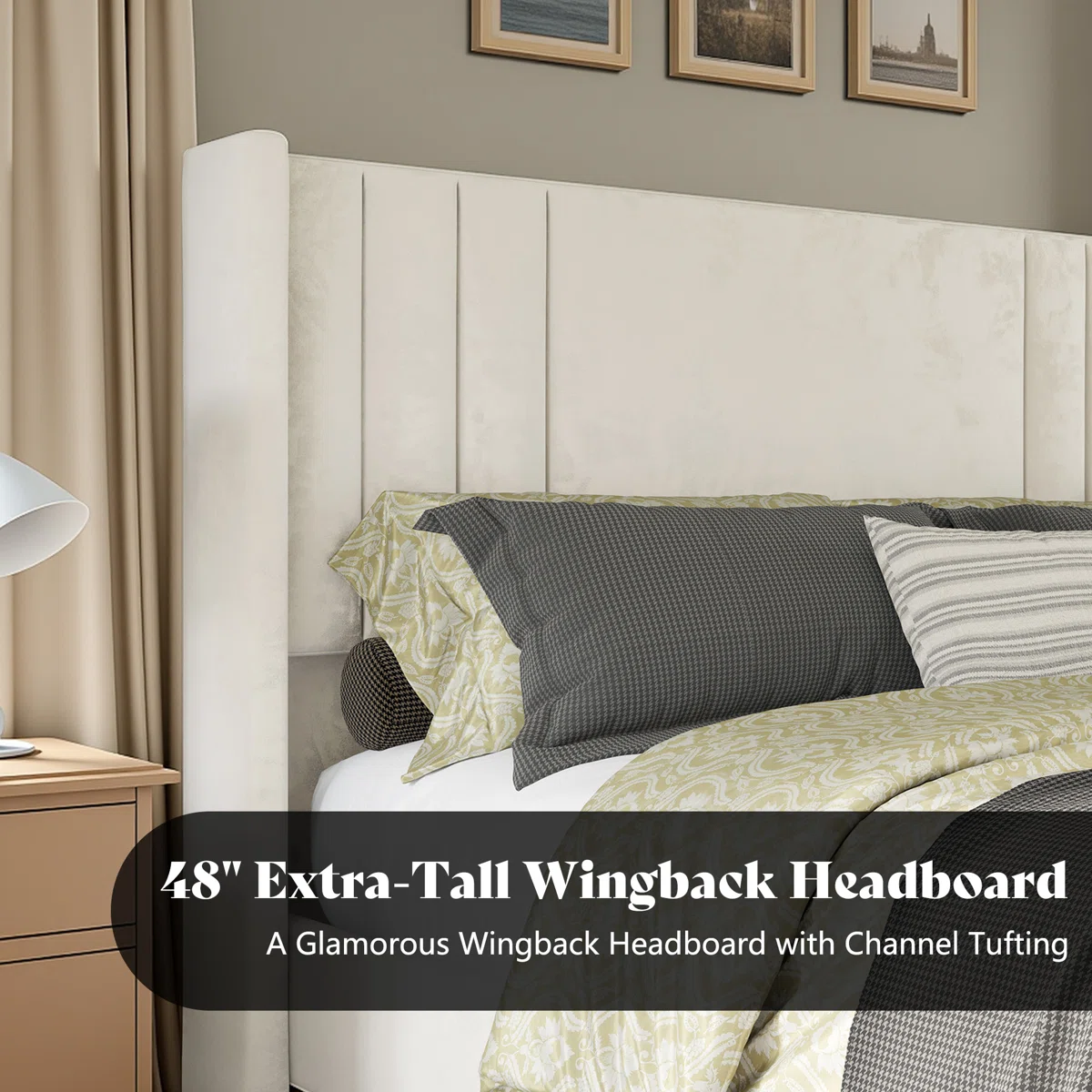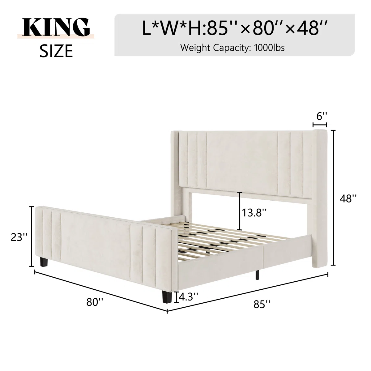 Velvet Channel-Tufted Wingback Platform Bed – Glam Upholstered Headboard